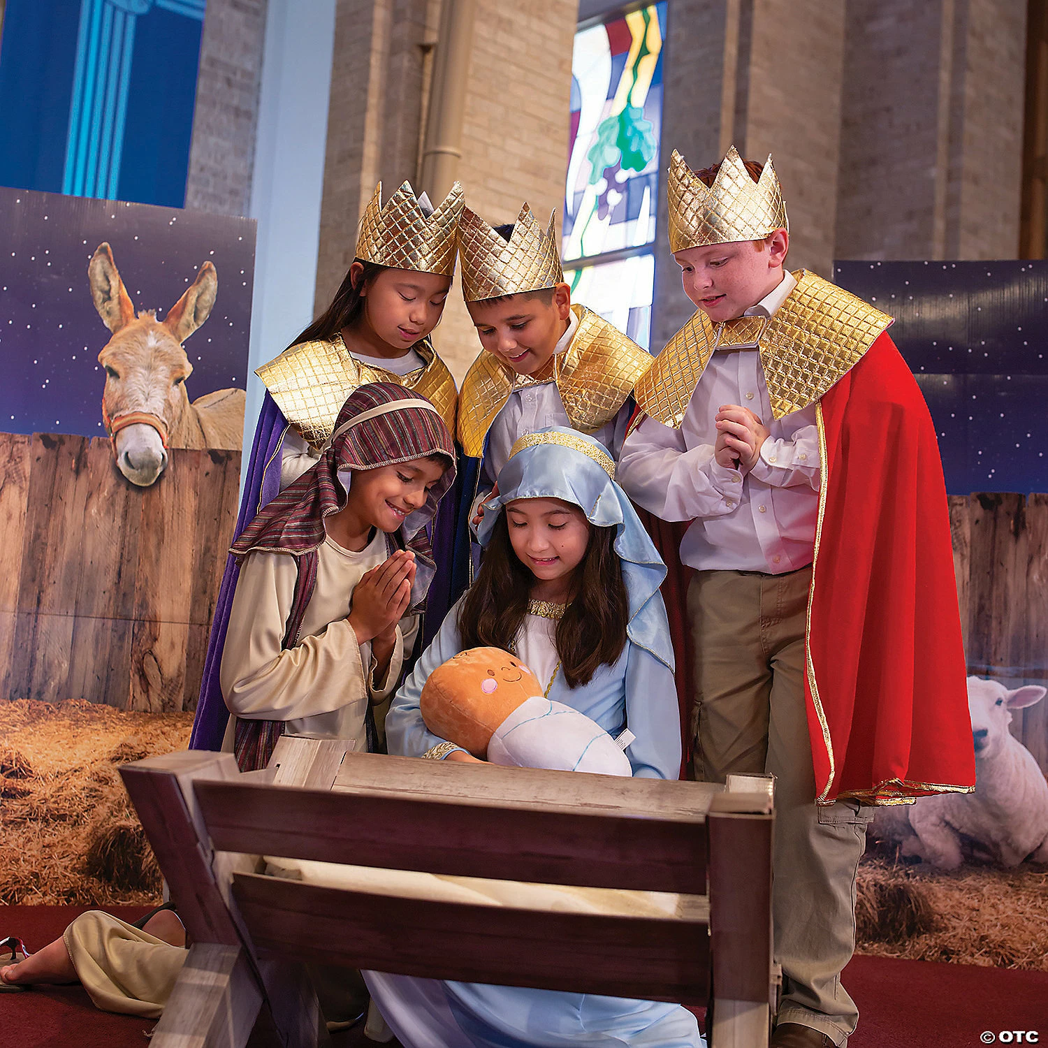 A wise choice for your Nativity scene or Christmas pageant, this cape and crown set are an easy way to dress the part of a marvelous magi. Create a DIY costume in no time when you add it to your church’s holiday supplies. Set includes a 90″ x 31″ cape and a 24″ x 6″ adjustable crown each with touch fasteners. Polyester with metallic gold accents. Imported. © OTC