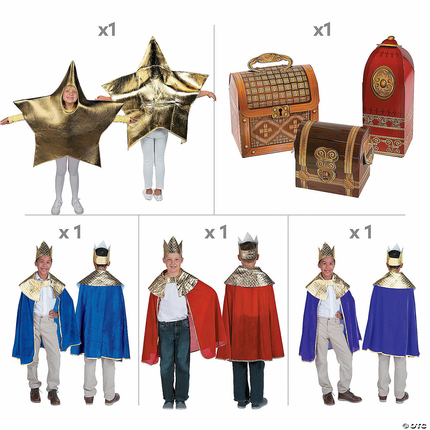 Finish up your Christmas pageant planning easily with this helpful costume kit featuring three Wise Men costumes along with props and a star costume. This costume kit helps dress the kids in a Christmas pageant as the three Wise Kings and the Christmas star. Make sure your three little Wise Men are costumed appropriately for an awe-inspiring Christmas pageant. (7 pcs. per unit) Assortment may vary. Includes:• 1 Polyester Child’s Blue Wise Man’s Cape with Crown Set (Set includes a 45″ x 16″ cape with 12″ ties and a 24″ circ. adjustable crown with touch fasteners. Imported.)• 3 Cardboard Wise Men Gifts Costume Props (Includes one 5″ x 3 1/2″ x 5″ chest, one 3 1/2″ x 3 1/2″ x 9″ box and one 7″ x 5″ x 7″ treasure chest.)• 1 Polyester Child’s Purple Wise Man’s Cape with Crown Set (Set includes a 98″ x 32″ cape with 12″ ties and a 21″ circ. adjustable crown with touch fasteners. Imported.)• 1 Polyester Child’s Red Wise Man’s Cape with Crown Set (Set includes a 45″ x 16″ cape with 12″ ties and a 24″ circ. adjustable crown with touch fasteners. Imported.)• 1 Polyester Child’s Star Costume (Fits up to child size 14. Imported.)