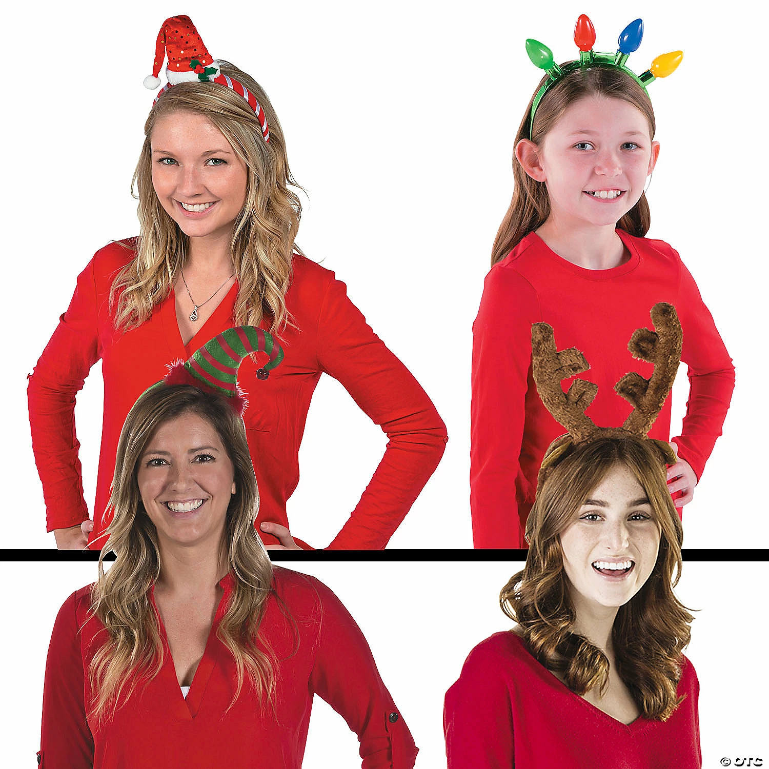 Get into the holiday spirit with these fun Christmas accessories! Hand these headbands out to your Christmas party guests or wear them during Christmas outings and caroling. From mini-Santa hats to light-up Christmas bulbs, this assortment has styles for kids and adults of all ages. Theyβre also great photo booth accessories that are sure to cause some giggles and holiday cheer! (24 pcs. per unit) Assortment may vary.Includes: β’ 6 Plastic Christmas Light-Up Bulbs Head Boppers (Batteries included. 5 1/2β x 8β)β’ 6 Mini Santa Hat Headbands (5″ polyester-wrapped headband topped with a 4″ plush Santa hat)β’ 6 Plush Deluxe Reindeer Antlers Headbands (Includes elastic strap. 14″)β’ 6 Elf Cap Headbands (6″ x 3 1/2″ polyester hat with marabou trim on a 5″ felt-wrapped headband.)