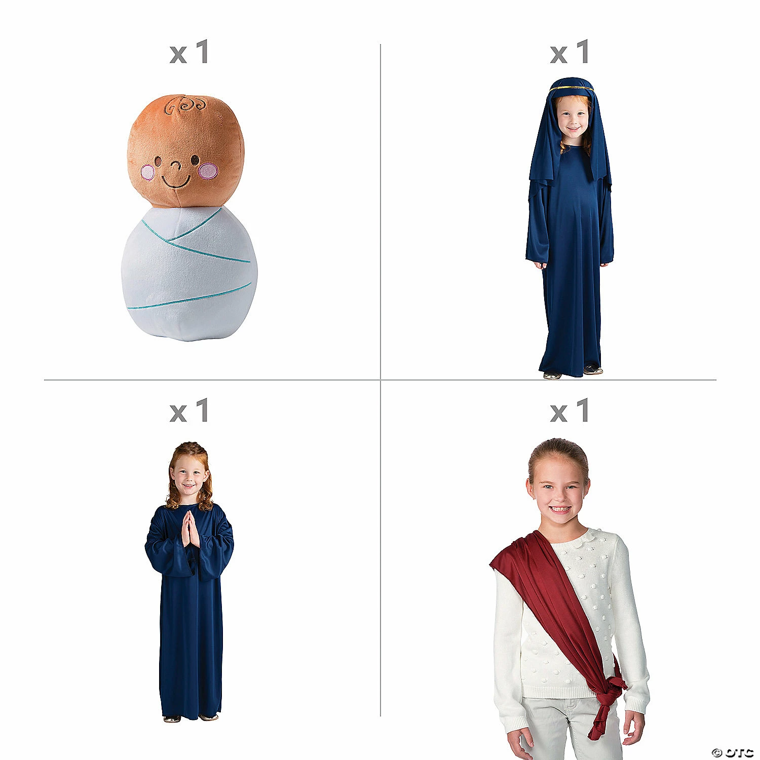 The Christmas pageant, Sunday school play or Nativity scene has to include a Mary character for it to be complete. This Mary costume kit includes the pieces you need to outfit a small or medium-sized child to play Mary and conveniently comes with a baby Jesus. (4 pcs. per unit)Includes:β’ 1 Polyester Kidsβ Navy Blue Nativity Headpiece (22β circ.)β’ 1 Polyester Kidsβ S/M Navy Blue Nativity Gown (20β x 38β Fits childrenβs sizes 4-8. Imported.)β’ 1 Polyester Maroon Costume Belt/Sash (60β x 14β Finished edges. Imported.)β’ 1 Plush Pageant Baby Jesus (12β)β’ Assortments are subject to change at any time and may vary from picture shown. Substituted items will be similar in nature.