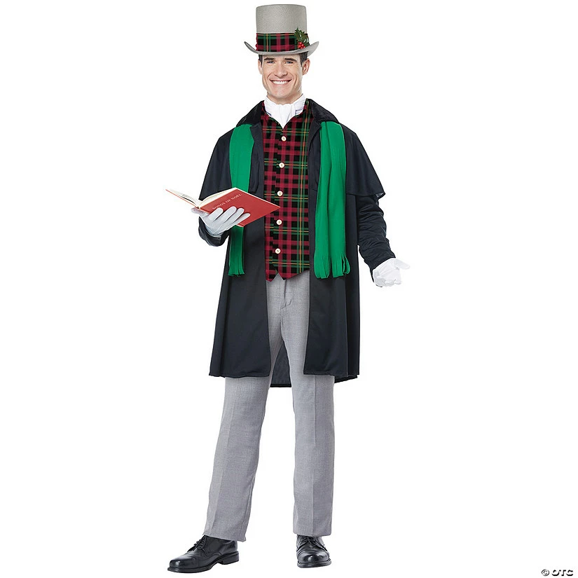 Spread holiday cheer while carrying a tune in this classic, Victorian inspired Christmas Caroler costume. Perfect for holiday plays or Christmas caroling in the neighborhood! Costume includes a black jacket, button down plaid vest, white ascot neck tie, green scarf, holly clip and a 3 piece to assemble top hat with band. Pants, book, white gloves and shoes are not included.Special Shipping Information: This item ships separately from other items in your order. This item cannot ship to a P.O. Box. This item may be subject to additional processing days. ITEM IS NOT ELIGIBLE FOR EXPEDITED SHIPPING