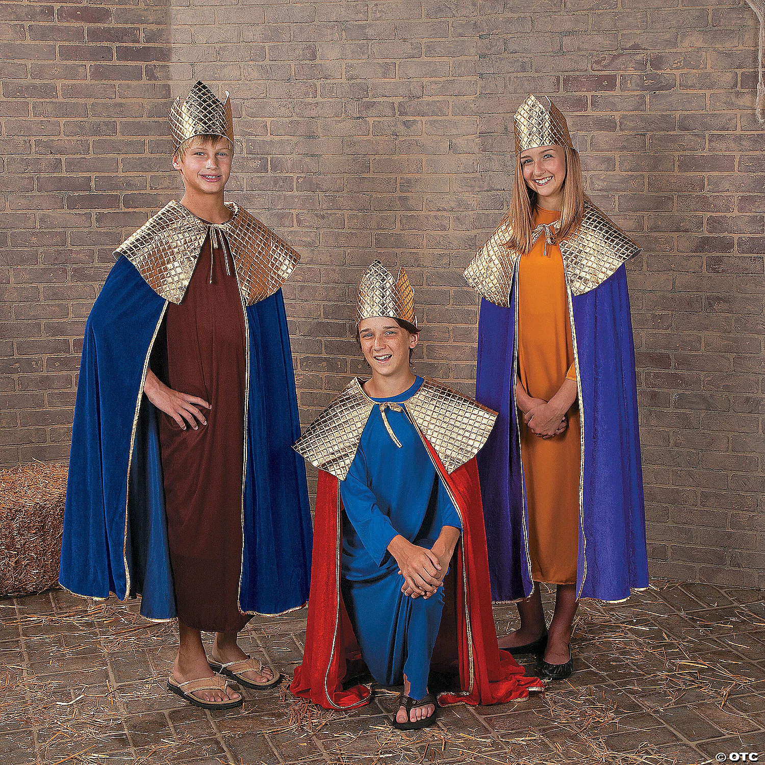 A wise choice for your Nativity scene or Christmas pageant, this cape and crown set are an easy way to dress the part of a marvelous magi. Create a DIY costume in no time when you add it to your church’s holiday supplies. Set includes a 45″ x 16″ cape with 12″ ties and a 24″ circ. adjustable crown with touch fasteners. Polyester with metallic gold accents. Imported. Β© OTC